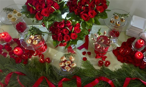 Lilly’s suggestions for easy, inexpensive decor include covering the table with wrapping paper instead of a tablecloth. Or decorate the table in classic holiday colors by layering evergreen boughs across the edge and scattering red rose petals over the rest.