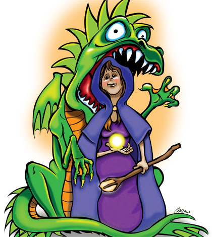 Now I have to bring my character to life in the form of a 1.5-inch pewter miniature. I search the Internet till I find one that looks like me. A few days later it arrives, a little silver statue I have to turn into Demetria. I put a layer of primer on it, then some color. Brown for the staff she holds in her left hand and blue for the crystal ball she holds in her right. Hair: brown. Hooded cloak: purple. A final layer of acrylic glaze and she’s good to go.
