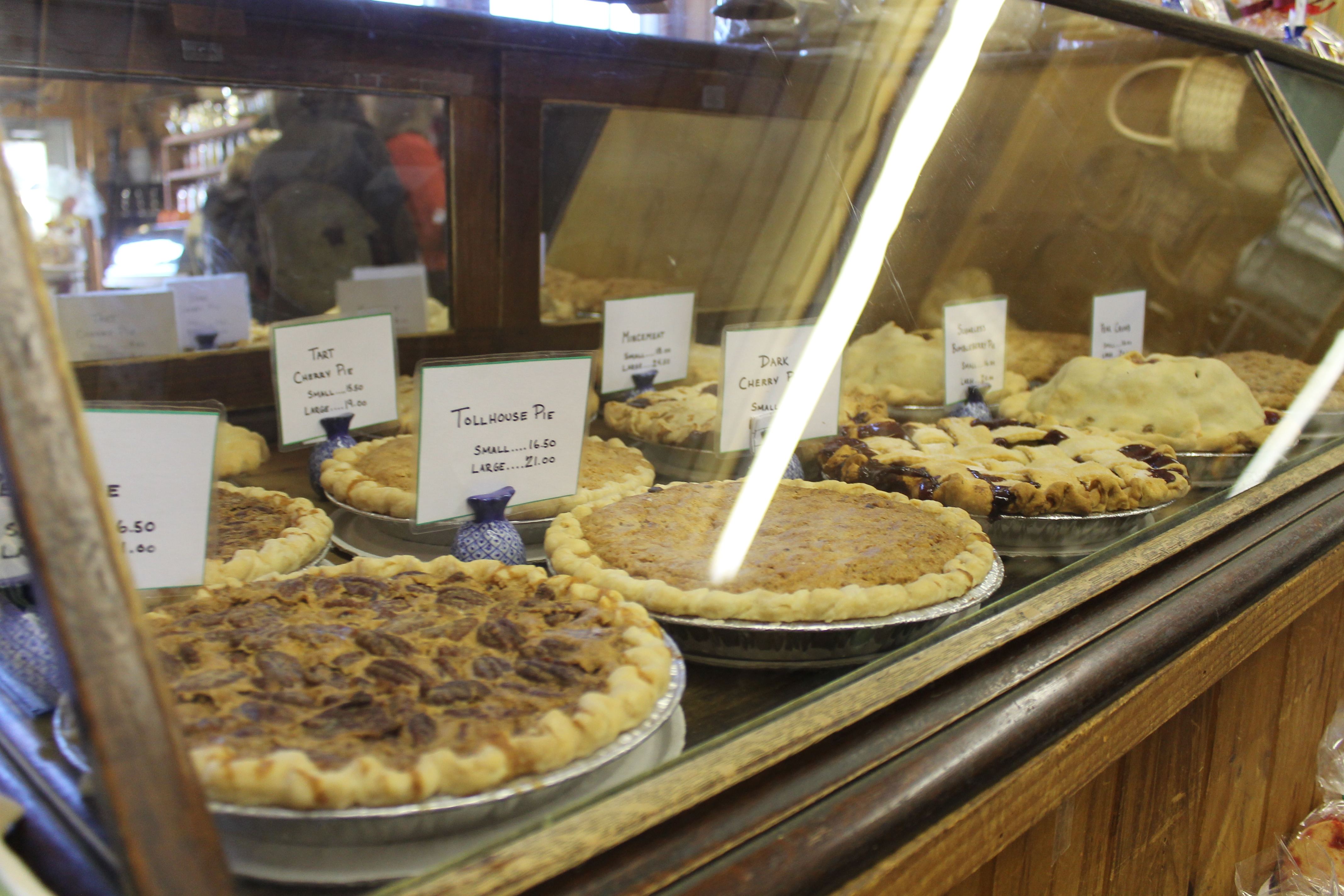 Customers can choose from baskets filled with fresh fruits and vegetables and other grocery items before making their way to the rear, where a line of shoppers chooses from the farm’s large selection of pies: apple, apple crisp, pumpkin and cranberry nut, among others.