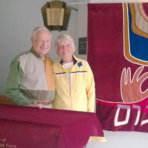 At the parochet’s official installation, the CTI community thanked the Corins for sharing their special anniversary in such a profound way and for presenting the congregation with such a magnificent gift.The Corins awarded the commission to Best Embroidery and then worked closely with the company owner on the design to assure that the parochet would be a welcoming and meaningful presence in the sanctuary. The design that resulted encompassed the main themes of a Menorah — a basic symbol of Judaism — and hands, recalling a priestly blessing, and also a greeting of welcome and good wishes.