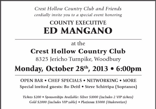 Democrats point to $500 in campaign contributions that Sgt. Sal Mistretta donated to Mangano’s re-election efforts on Oct. 18, in addition to $100 he gave Mangano in March. Mistretta’s name also appears on a Mangano fundraiser invitation dated one week prior to the election. Democrats claim Mistretta was one of the “apparent organizers” for the Crest Hollow County Club event, which included The Sopranos star Steve Schirripa. Donations ranged from $200 to $5,000, according to an invitation provided by Nassau Democrats.