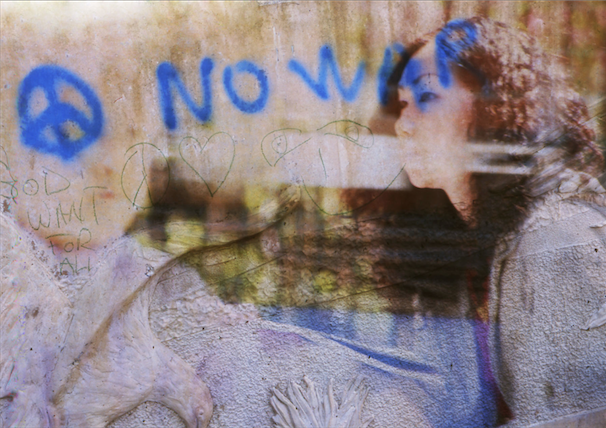 For her multi-layered photograph “No War,” Katherine Criss explained that she saw an anti-war graffiti sprayed in blue on a concrete wall along Riverside Drive in Manhattan and then took another image moments later of a young woman jogging past her. The superimposed words seem to float out of the plane of the photograph and hover in the mind of the curly-haired runner.