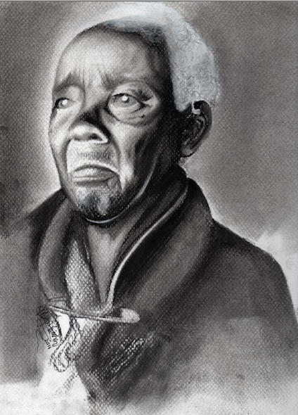 In Trimner’s evocative drawing, the elderly slave woman, whose white curly hair forms almost a halo around her, is grimly staring off into space, her eyes luminescent with sorrow and yet a spark of light.