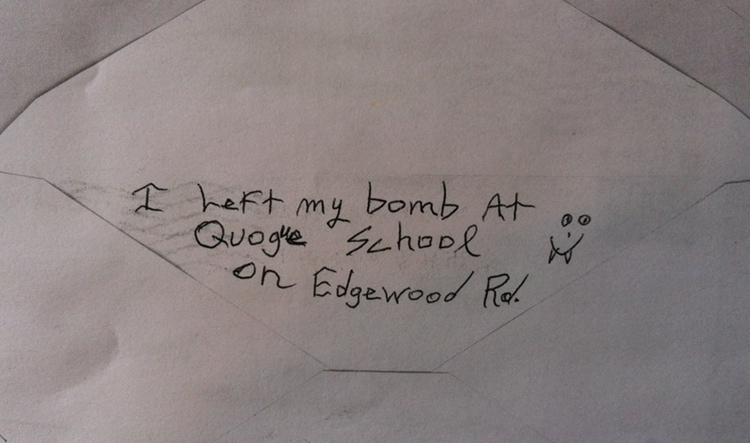 That warning, postmarked March 25 and March 26, 2013, also mailed from Mid-Island and written in black ink on the inside of an empty envelope with no return sender, declared: “I Left my bomb At Quogue School on Edgewood Rd.”