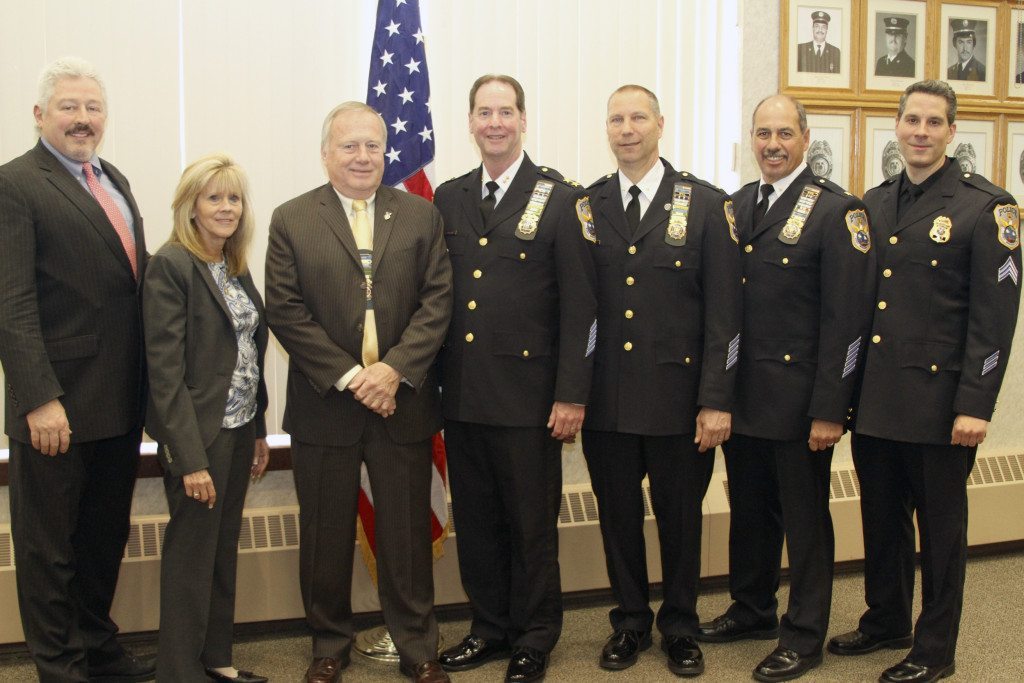 The Port Washington Police District designated Lieutenants Robert Del Muro and Jeffery Morris as Deputy Chiefs, and Police Officer Andrew Scobbo was sworn in as Police Sergeant. At the ceremony were (l. to r.) Commissioner Dave Franklin, Commissioner Angela Lawlor-Mullins, Commissioner James Duncan, Acting Chief James Salerno, Morris, Del Muro and Scobbo.