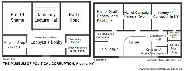 Roter’s proposed museum would contain a “Lobbyist’s Lobby” (featuring an actual revolving door in the center of the room), a “Tammany Hall” lecture hall, and opposing Halls of Shame and Honor. It would serve as both an entertainment and educational facility that would take both a serious and whimsical look at the history of corruption in New York State. It would accept $12.50 “bribes” for admission. Children under the age of 12 would be $6.50, but according to their website, “parents are encouraged to lie about the age of their children.”