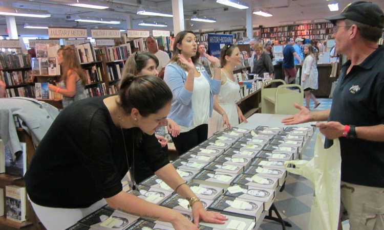 Clinton sat down exactly at 6 o’clock, as promised, sparking applause and cheers, greeting the crowd with a big smile, “It’s good to see you! Thank you for coming!” Beaming beside her were Huntington Supervisor Frank Petrone, Town Councilwoman Susan Berland, and State Comptroller Tom DiNapoli—all Democrats and all big fans. They posed for the first pictures and took off. The store staff and volunteers, plus a handful of interns, kept people moving like a human conveyor belt. There was constant laughter and chatter.