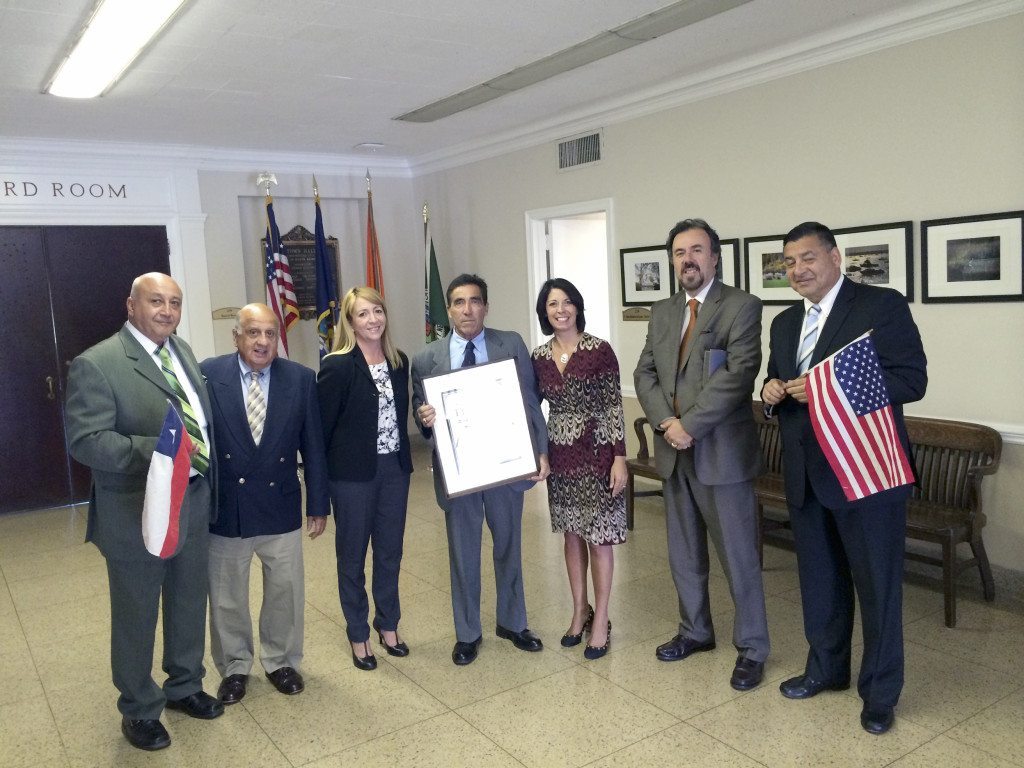 He received a proclamation from Councilwoman Dina De Giorgio at Town Hall, flanked by friends and dignitaries proudly holding the Chilean and American flags.