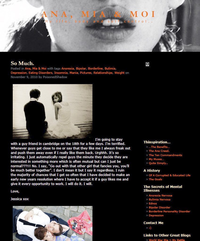 The Internet has become a dangerous world for those with low self-esteem and eating disorders. ED, Ana, and Mia are the unfortunate triad that encourages people to “skip one more meal” or “experience guilt after eating.” Many websites have personified eating disorders to connect with teenagers: ED stands for eating disorders, Mia for bulimia, and Ana for Anorexia. With the Internet’s ability to reach thousands of people, blogs and websites have increased the risks for teenagers to develop unhealthy lifestyles.
