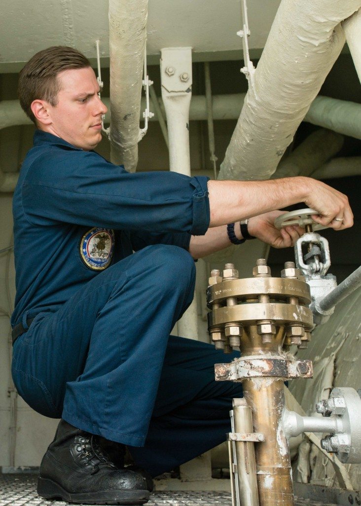 Machinist’s mate third class Jake Hojnowski of Glen Head is pictured here closing a valve during a steam catapult demonstration aboard USS John C. Stennis. The crew is currently preparing for the Navy’s Board of Inspection and Survey. According to Naval personnel, The John C. Stennis is returning to the U.S. 7th and 5th Fleet areas of responsibility four months ahead of schedule in order to maintain combatant commander requirements and Navy assets in the region.