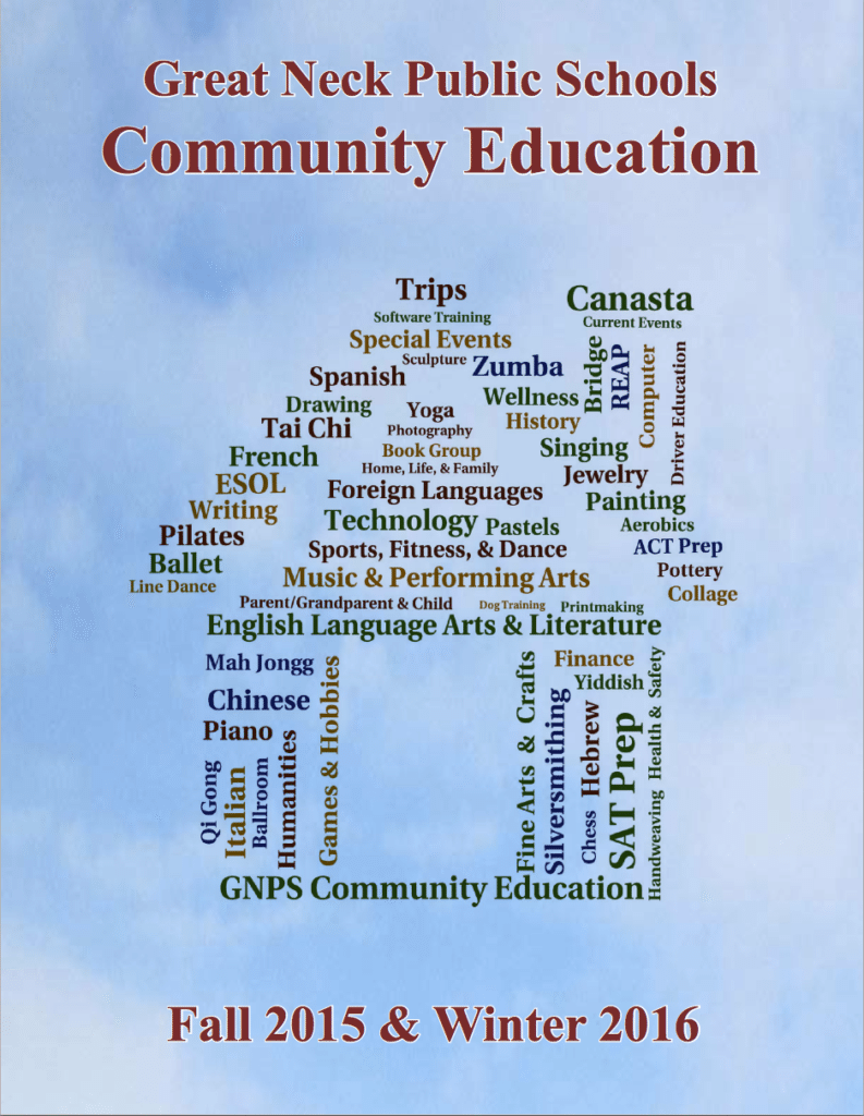 Fall registration for Community Ed is currently ongoing. Whether it’s fine arts and crafts, fitness and sports, foreign languages, games, humanities, music appreciation and performance, technology or trips and special events, there are hundreds of classes that meet weekdays, evenings and Saturday mornings. Classes meet at the Cumberland Adult Center, 30 Cumberland Ave., Great Neck (one block south of Northern Boulevard off Lakeville Road).