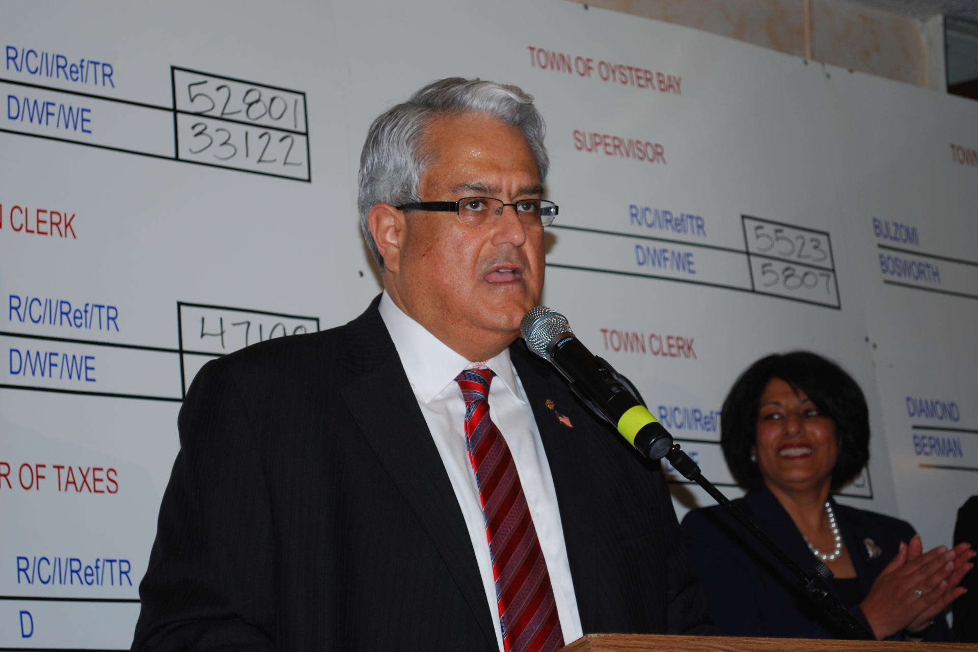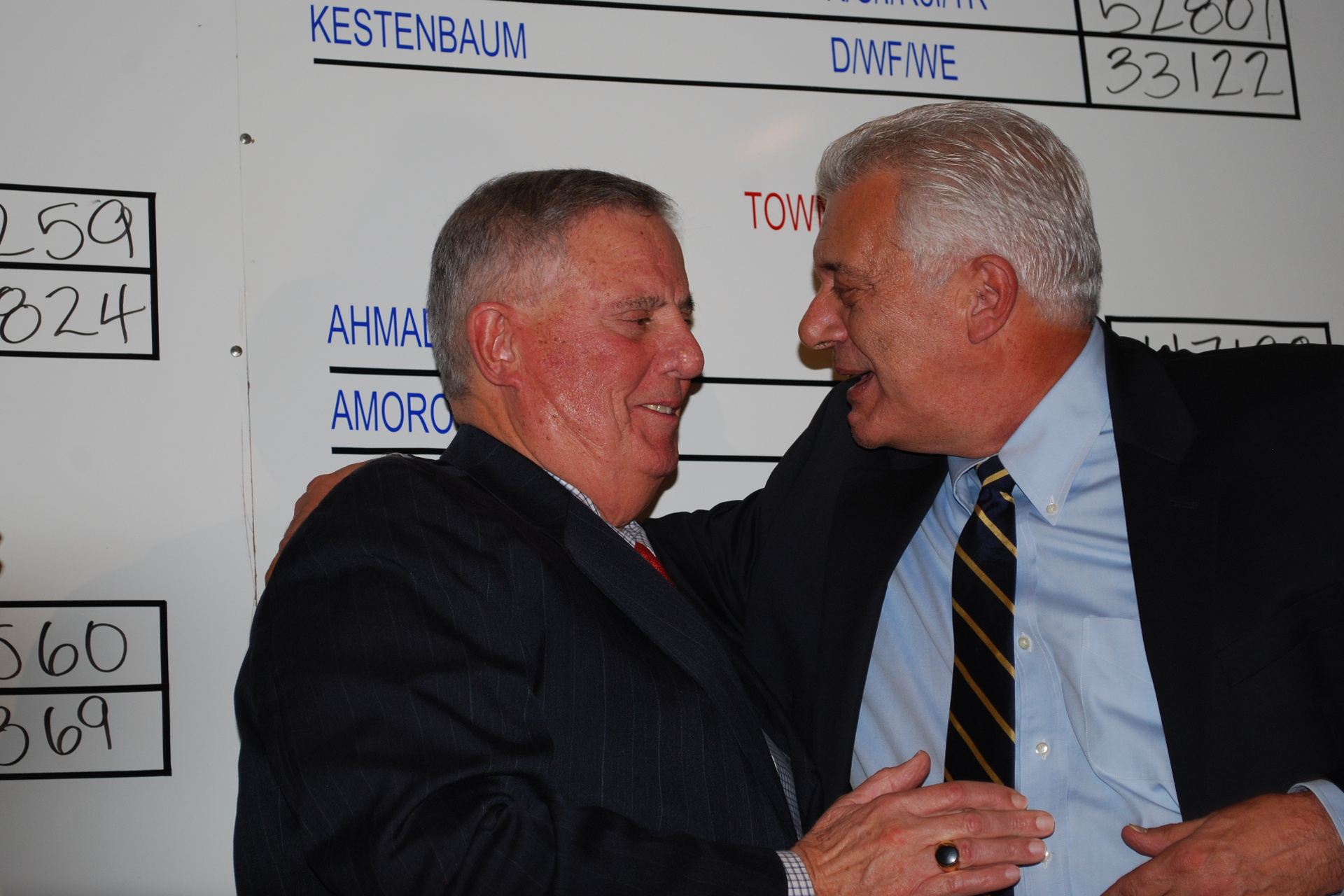 After he got through congratulating the victorious judges, Mondello praised Supervisor John Venditto as “a hardworking, tough guy who’s been around for a while, and he’s very, very good for the people of Oyster Bay.” Then he referred to Venditto’s race, whose numbers on the tally board still showed the incumbent trailing.
