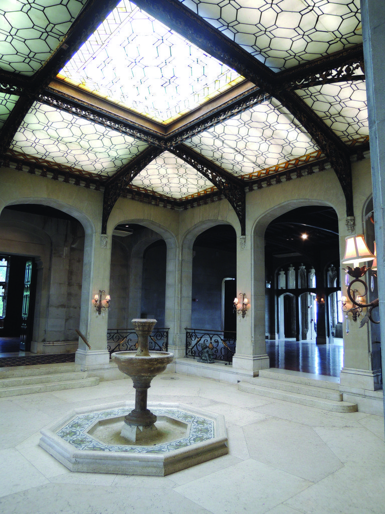 The 40-room castle is one of the most elaborate estates on the Gold Coast. From the portico, visitors enter the mansion’s 60-foot entry foyer with stained glass windows and a massive original chandelier and wooden staircase. The ground floor features a sunken palm court with a Tiffany stained-glass ceiling. The summer living room opens to the estate’s rose garden, fountains and terrace, which overlook the beach and bay, and feature working stone-carved fireplaces. The bedrooms and newly renovated marble bathrooms proportionately complement the grand scale of this mansion.