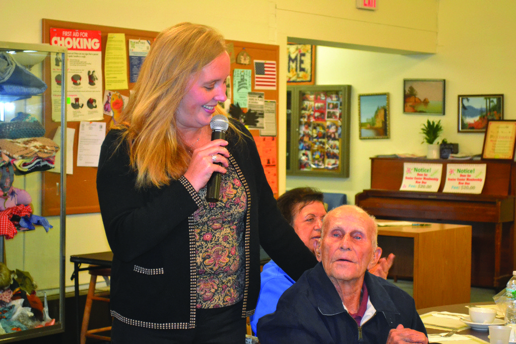The newest member of the Port Senior Center, Ed Sautkulis (pictured with Legislator Delia DeRiggi-Whitton), said he celebrates being 97-years-young every day.