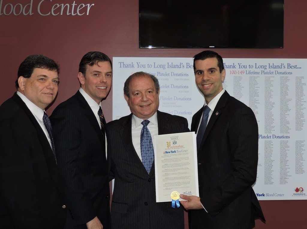 nor Center in Massapequa. New York Blood Center (NYBC) is one of the largest community-based, nonprofit blood collection and distribution organizations in the United States. Through the integrated efforts of various blood service operations, NYBC annually provides one million blood components to nearly 200 hospitals throughout the New York/New Jersey area. Pictured with Councilman Pinto for the ribbon cutting ceremony are Nassau County Legislator James Kennedy (second from left) and Senator Michael Venditto (right) who presented a Proclamation to Harvey Schaffler, the Executive Director of Donor Marketing at the New York Blood Center in recognition of the newly-opened Blood Donor Center in Massapequa providing a valuable and lifesaving service to the local community and beyond.