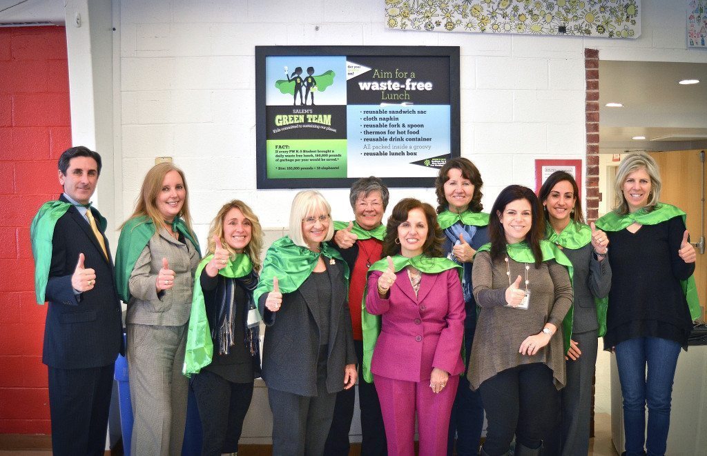 With Green Team leaders donning green “environmental superhero” capes, the campaign features oversized signs with easy suggestions on how students can do their part to protect the planet. In cafeterias, the signs focus on a waste-free lunch. In bathrooms, they focus on water conservation. And, in the main entrance, they provide golden rules for a green school such as recycling, reusing and aiming for less car trips.