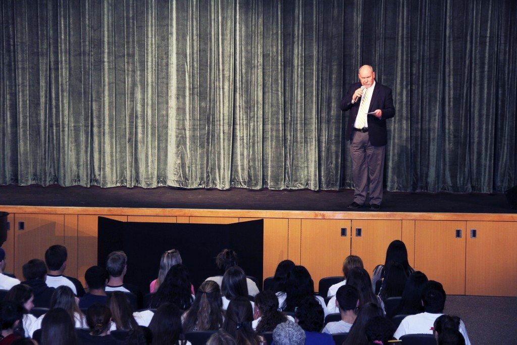 “This is the central location for Carle Place, for the community, the school,” said Carle Place Middle/High School principal Thomas DePaola. “We’re very excited to have a space that’s fitting for that.” Students gathered in the new auditorium for the assembly, where they got to experience the cushy green seats and state-of-the-art theatrical sound and lighting for the first time. Many students expressed out loud their delight in the renovations, which include LED lighting, back-lit panels on the walls, new carpeting, flooring and an emerald green curtain. The space features upgraded technology and sound equipment, including acoustical clouds on the ceiling, which help control the sound in the room, as well as an open sound booth.