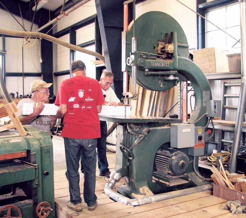 A great deal of lumber goes into making the boat and the volunteers use their outside saw mill to cut logs into planks that then are brought into the shipyard building to be sized and shaped. One of the problems of working with wood is the amount of dust that can fill the air if precautions are not taken. That interior sawing machine has a vacuum system hooked into it that feeds four large canvas bags and one tank outside the building. The smaller particles go into the bags and the larger chunks go into the tank.