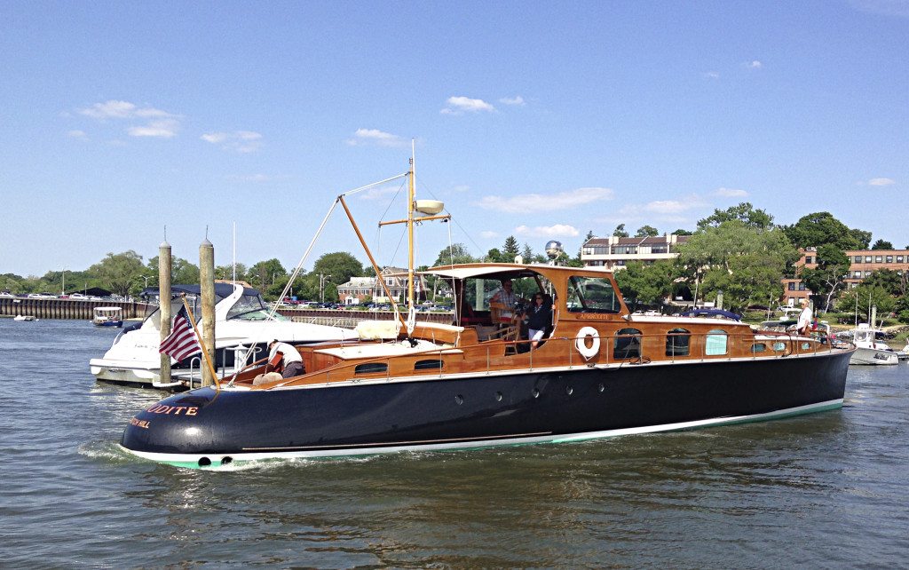 One of the Purdy Boat Company’s most famous works was the Aphrodite, built for multimillionaire John Hay Whitney. “Aphrodite’s guest list over the years reads like a ‘Who’s Who’ in the worlds of government, business and entertainment with such luminaries as Fred Astaire, Sir Laurence Olivier, Spencer Tracy, Katharine Hepburn, Henry Ford II, FDR advisor Harry Hopkins and Nelson Rockefeller aboard for summer day cruises down Long Island Sound. Aphrodite also once served as the site for a birthday party for Shirley Temple.”