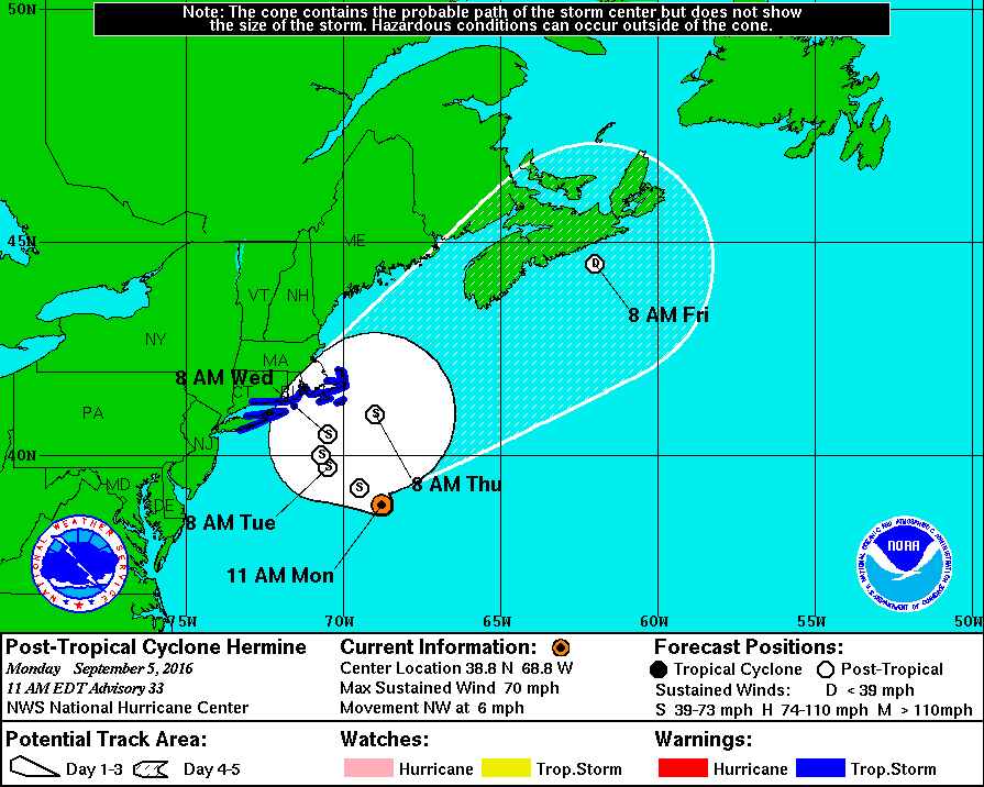 Hermine made landfall in Florida last week as a hurricane but was quickly downgraded to a tropical storm before churning across Georgia and the Carolinas. It then stalled in the Atlantic before continuing its northward track.