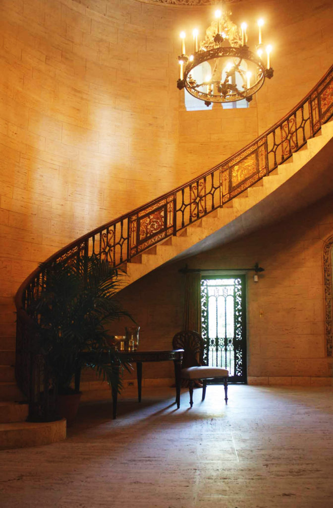 The mansion has a vaulted entryway with carved stone walls, Palladian arches, embellished fireplaces, patterned marble floors, intricately carved wooden doors and a domed rotunda with a spiral travertine staircase. The staircase is highly recognizable, recreated exactly for the set of director Baz Luhrmann’s The Great Gatsby (2013). The home has been used as the backdrop and set of many period films, historic photo shoots and more.