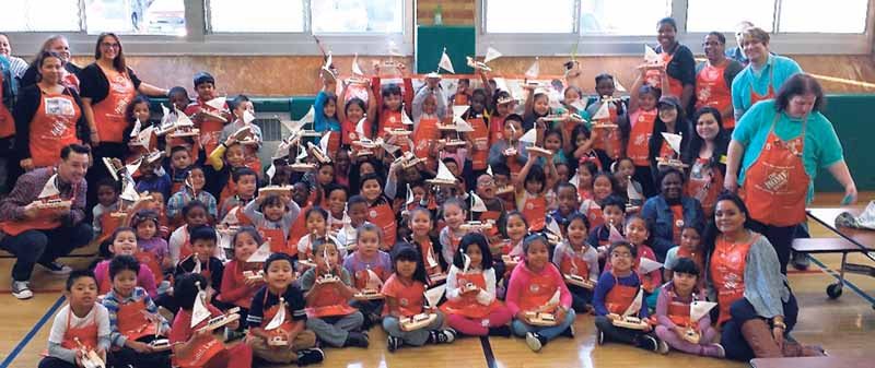 The Home Depot recently partnered with the Dryden Street School to have the kindergarten students participate in a project about the power of wind. Sponsored by PTA President Ms. Lomax and Ms. Ramos, a parent of a kindergarten student and employee at Home Depot, 340 students were engaged in hands-on activities that were based around the concept of STEAM. More than a dozen employees from Home Depot were on hand to teach the students how to build a wooden sail boat and the students were extremely proud of their creations. The partnership with Home Depot taught the kindergarten students an important lesson about hands-on experiences and they were excited to share their creations with family members.