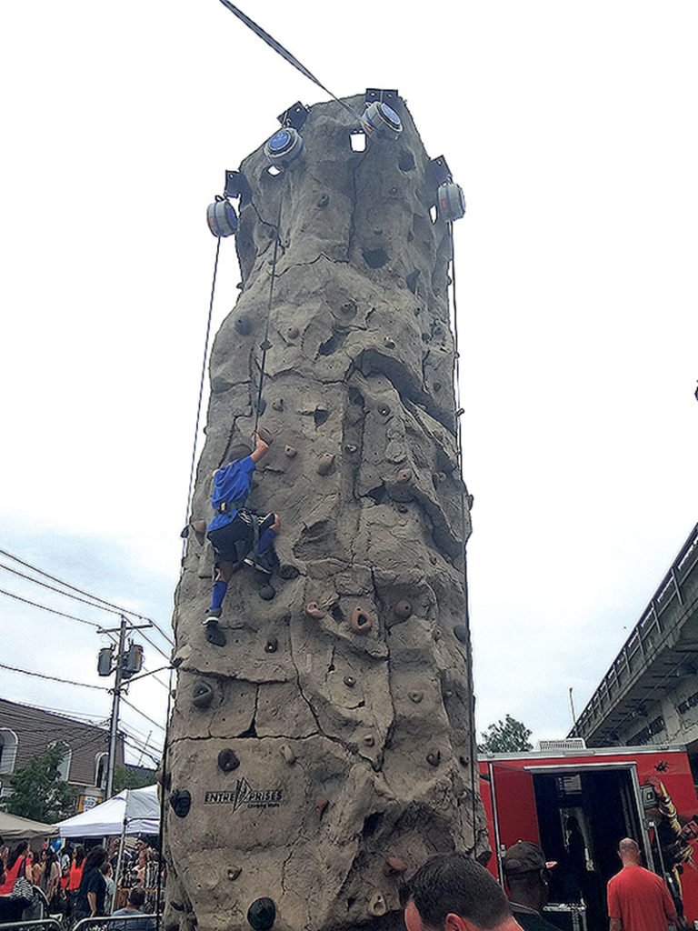 A youngster tests his strength and endurance on a challenging rock-climbing wall erected in the middle of the street.