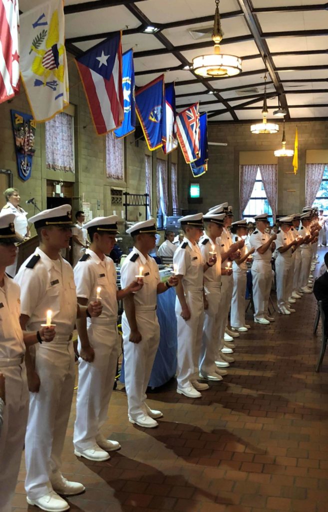 The program began with a candlelight vigil by the Class of 2022, recognizing the 142 cadet-midshipmen who were killed in action during World War II. With candles in hand, 142 members of the Plebe Class encircled the dining hall and each recited the name of a lost schoolmate before eight bells were sounded, signifying a mariner’s end of watch.