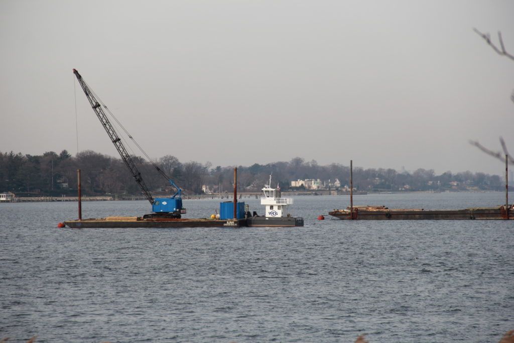 Neighbors have been noticing a huge crane and barges being brought in to Manhasset Bay, which will be used to finally begin work on the overflow culvert at Leeds Pond.