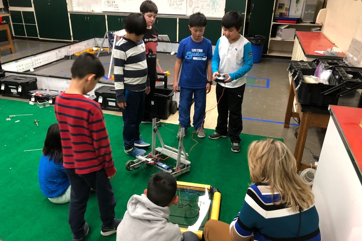 In order to compete, the team had to design and build a VEX robot, learn how to code it, then have it perform the various tasks of the challenge, such as throw a ball, toggle a flag, flip a cap, and park on a platform.