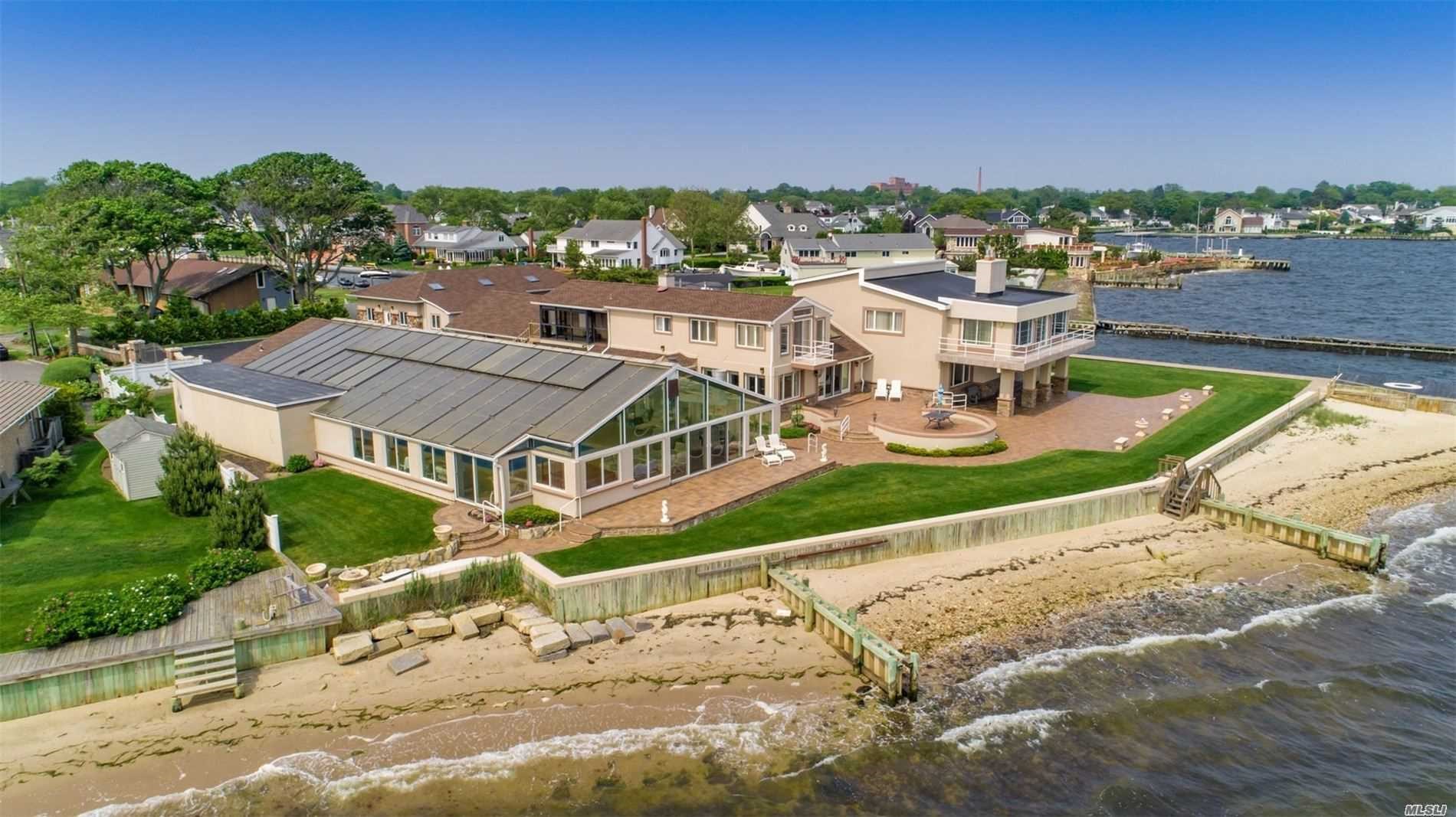 This stunning gated home overlooking the Great South Bay and boasting a helipad is listed for sale at 151 Wagstaff Ln. in the Magoun Landing section of West Islip.