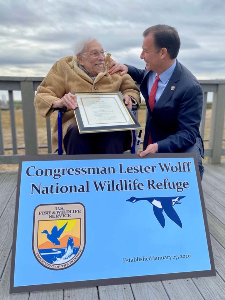 Congressman Tom Suozzi (D—Glen Cove) announced the official renaming of the Oyster Bay National Wildlife Refuge to the Congressman Lester Wolff National Wildlife Refuge. Congressman Lester Wolff, who recently celebrated his 101st birthday, is the oldest living former member of Congress and was instrumental in the creation of the federal refuge in 1968.