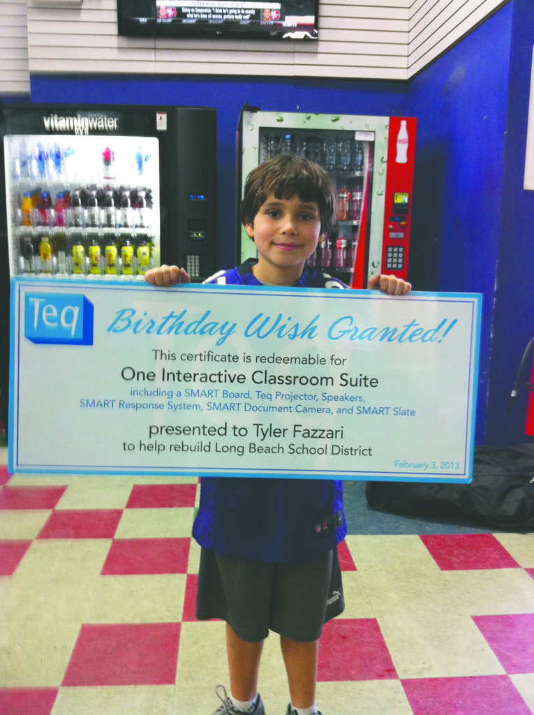 Inspired to create change and bring happiness to those around him, especially in the days and weeks after Hurricane Sandy destroyed many parts of Long Island, Fazzari began his first fundraiser by raising more than $20,000, which he donated to Long Beach’s East Elementary School. With the help of his mission, he was also able to donate a complete SMART Board system from Teq Smart Technologies, so the students could continue to learn with technology in the classroom.