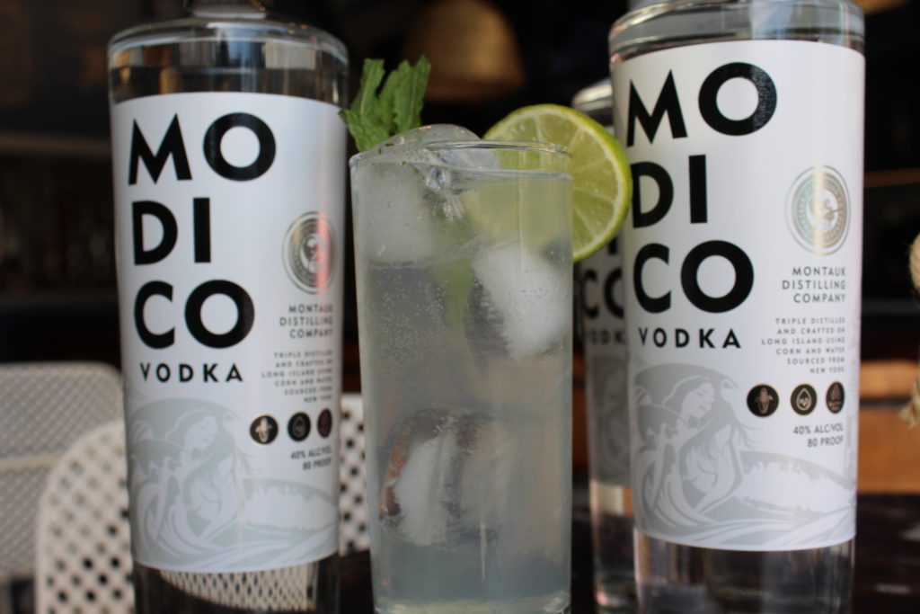 The ingredients in the Modico Collins include Modico Vodka, agave nectar, freshly squeezed lime juice, club soda, LI bubbly and mint sprig.