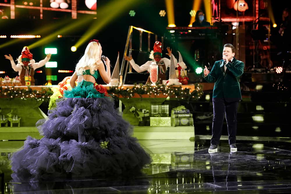 The night before, Carter sang “The Climb” by Miley Cyrus and “Up From Here,” and an original song by a songwriter that came on the show. On the night of the finale results show, he and Stefani sang a duet of “You Make Me Feel Like Christmas.”