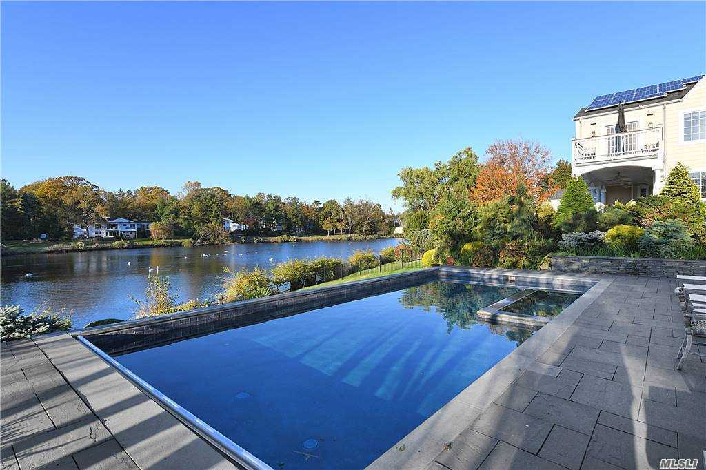 Grist Mill House, a modern colonial mansion overlooking a pond, is listed for sale at 200 Gristmill Lane in Great Neck.