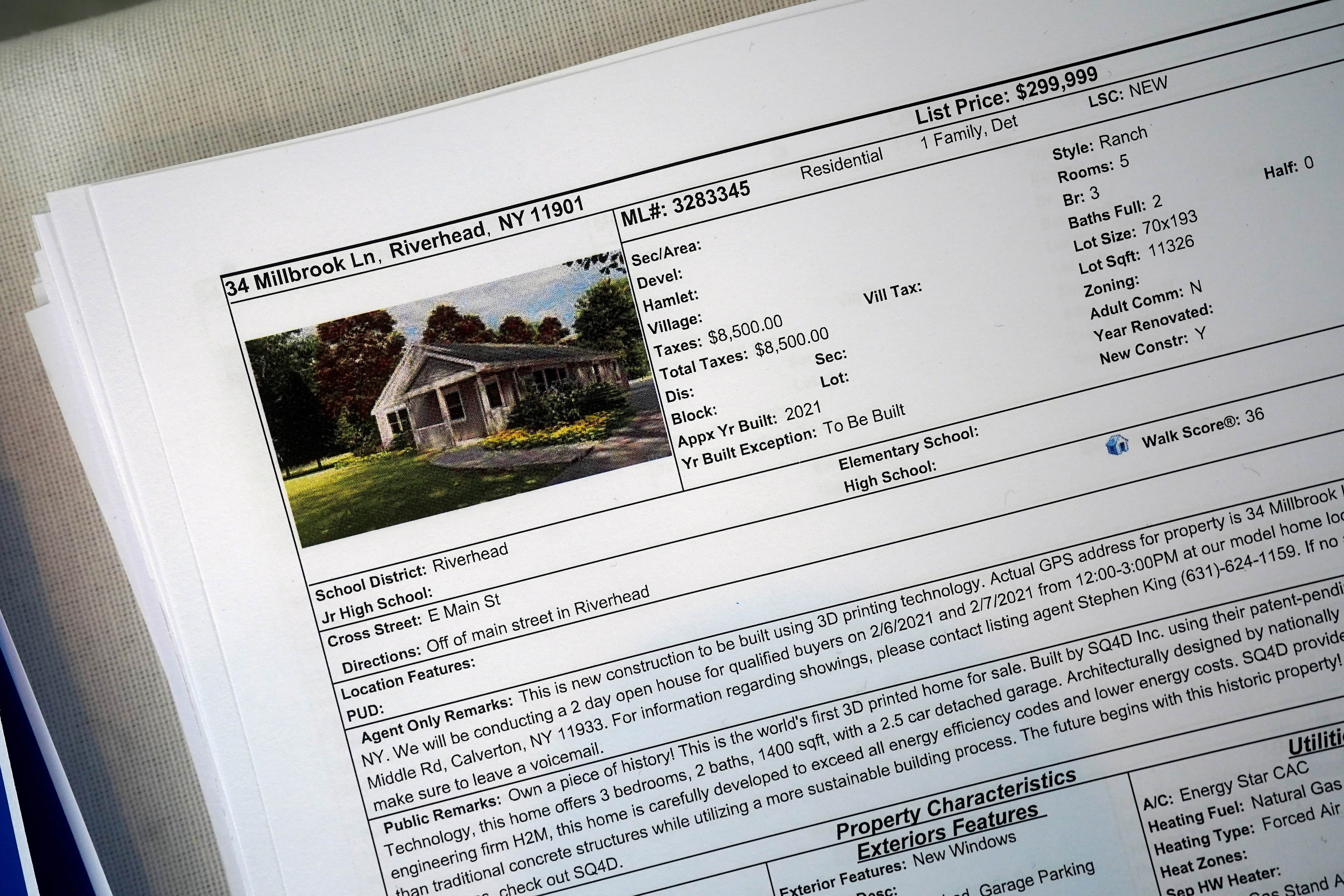 The demo house was built by construction firm SQ4D, to show the public and industry what was possible. Now the company is putting one up for sale – a still to-be-built house in the nearby town of Riverhead, which has been listed on property site Zillow at $299,000.