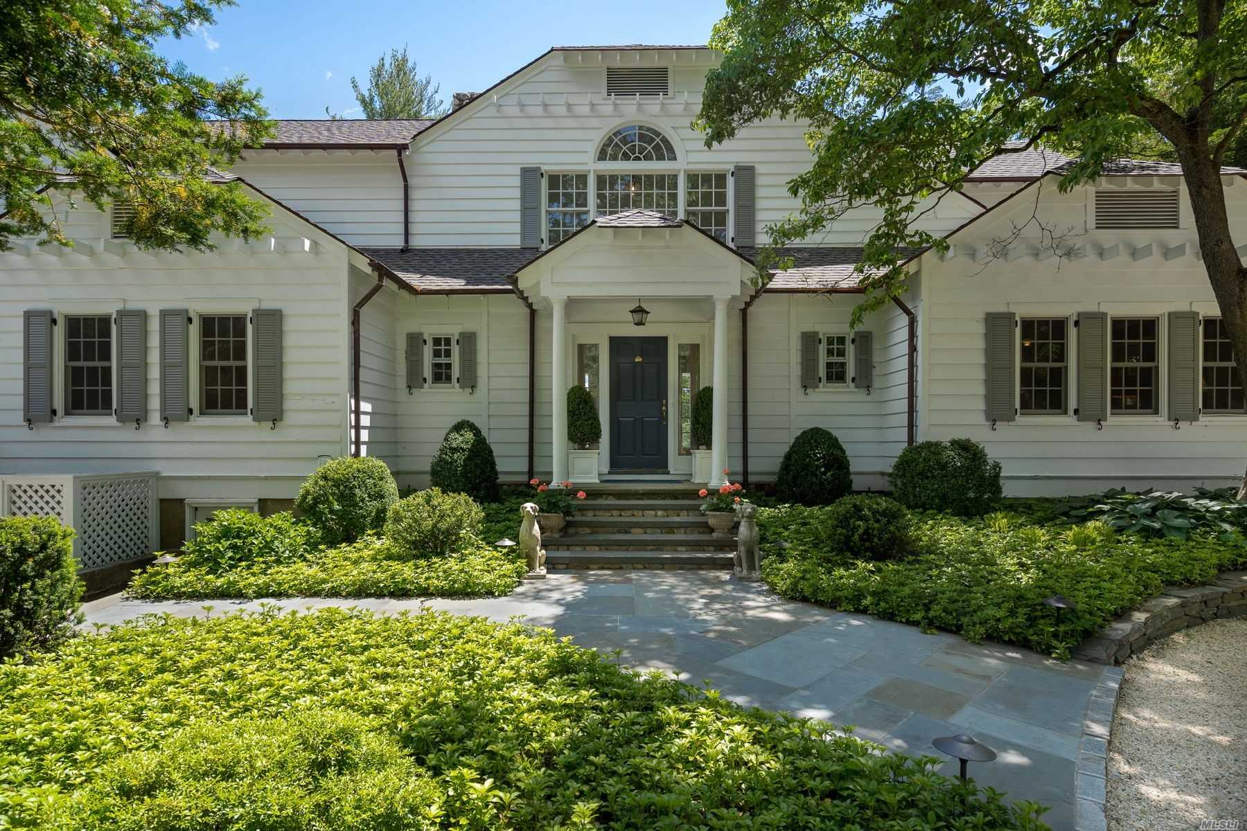 The polished estate includes an outdoor, inground swimming pool, tennis court, two-car garage, and private access to the beach on the Oyster Bay Harbor. The property is secluded with trees and shrubbery surrounding the house and grounds, and the lawn, plants, and trees are all well-manicured.
