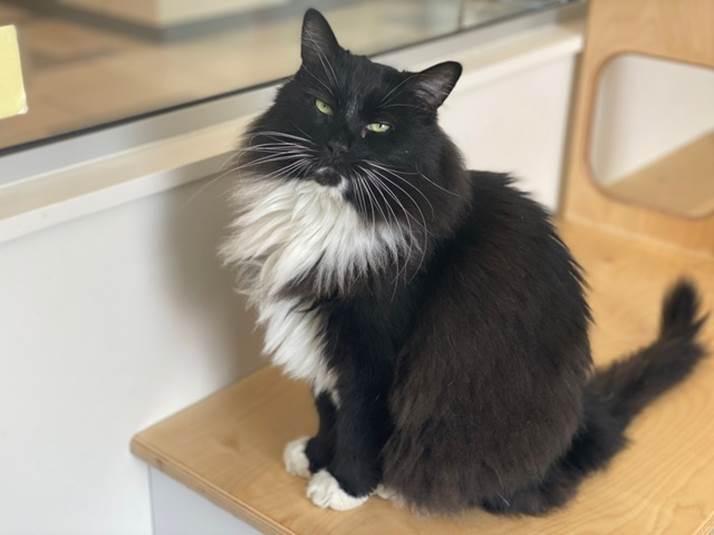 **Senior Alert** Initially, 11-year-old Felix (Adoption #E00550) wasn’t too thrilled to lose his lifelong home recently, but with a little reassurance, he’s decided to look ahead at the opportunity of making new friends in hopes it will lead him to a place to retire to. This sweet, friendly gentleman is always dressed for the occasion in his fancy, long tuxedo coat, and you may have to excuse as he wanders off to explore new surroundings before coming back for that head rub you’re offering. Doesn’t he sound dreamy?