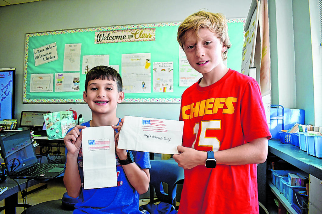 Aside from the Zoom meeting, fifth-grade classes from both schools participated in a special Veterans Day community service project. Students created care packages for retired service men and women. They decorated their bags with words of appreciation and patriotic images and placed items such as candy, a notebook, pencils, and a keychain into them.
