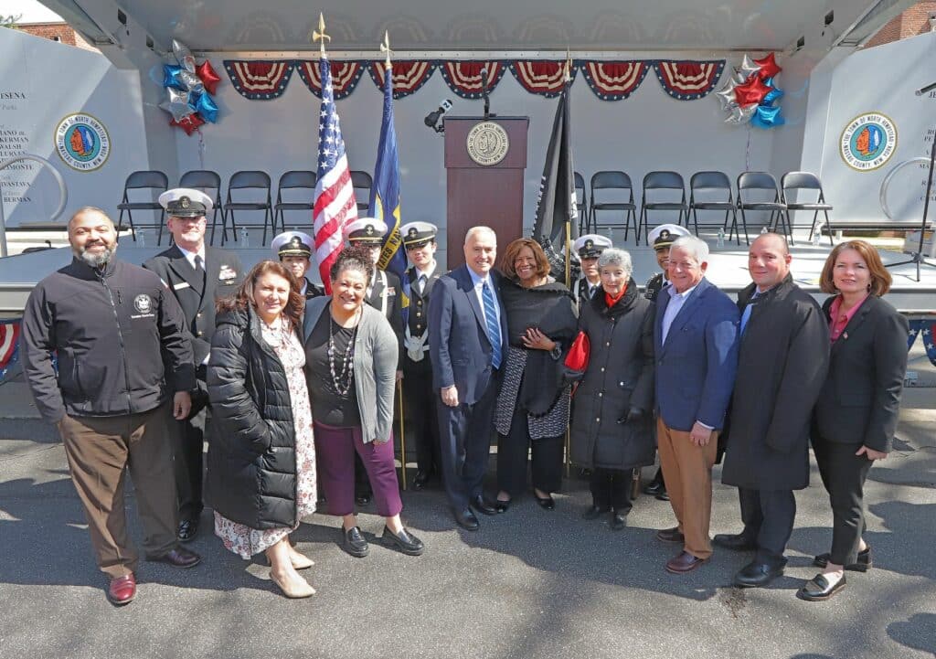 Joining Dukes was North Hempstead Council Member Robert Troiano, Jr., and Nassau County Legislator Siela Bynoe. The ceremony took place outside the Roslyn Gardens apartment complex.