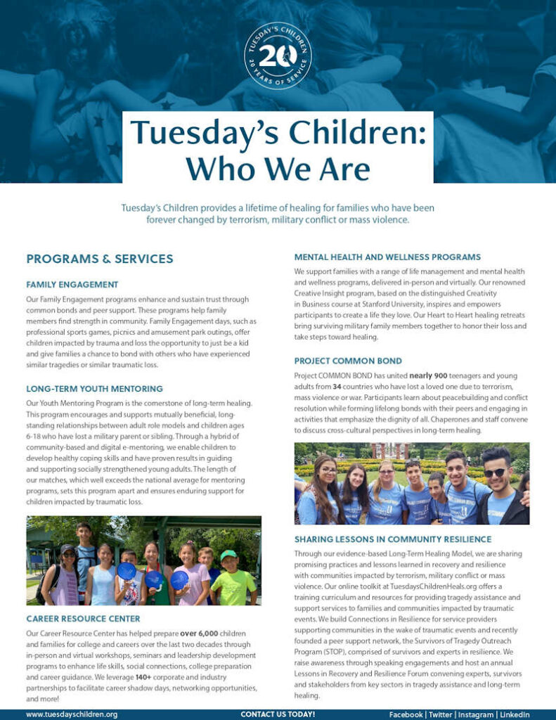 Through a time-tested, long-term approach, Tuesday’s Children programing serves and supports our nation’s military Families of the Fallen; keeps the promise to support all those impacted by Tuesday, September 11th; and builds resilience and common bonds in communities worldwide recovering from tragedies.