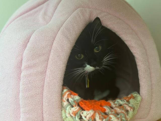 One-or-so-year-old Cassidy has been with Lend-a-Paw for some time now, as she patiently awaits a foster or adopter who can work with her on trusting humans and accepting love. She will require more one-on-one time but has been opening up to volunteers more and more each day. Cassidy loves other cats and would do best in a quiet home.