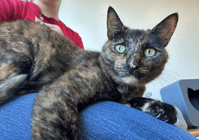 Are you a tortie lover looking for a tortie to love? You’re in luck because two-year-old Esti (Adoption #L80615) is the model of tortie purrfection! This stunner likes to take in her surroundings before diving in for her fair share of treats. She’s the champion of feather hunting and knows how to make available laps for her staycation. A cat-experienced home with older children who can follow her lead is exactly the home she’d thrive in.