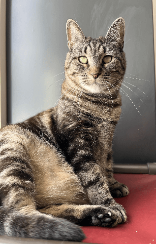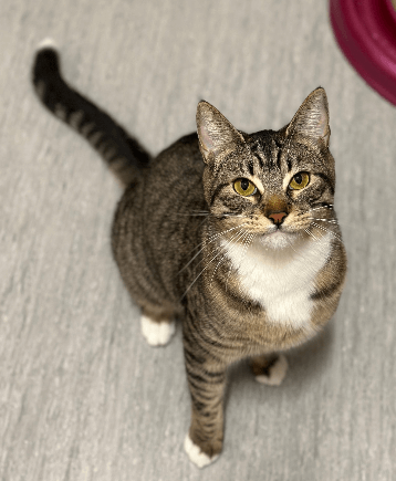 Doggy, a handsome brown tabby with brown paw pads was rescued with his brother and sister and given his name by a 3-year-old. He began his foster experience worried about human contact but he has developed into an affectionate purr machine, who cries when he needs attention. Doggy is a full of energy baby who races around like a man on a mission, chasing his siblings and wrestling. He likes wand toys and anything dangling that he can bat around. Doggy will make an excellent addition to any home!