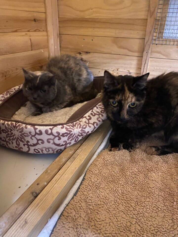 **Special Request and Double Adoption** Lola and Juno were neglected since they were kittens. Because they weren’t all that social, they were thrown in an attic for 10-12 years. When Lend-a-Paw received them, Lolas nails were severely curled into her paw pads, making it painful to walk. Juno was severely skinny and malnourished upon a visit to the vet, it was discovered that Juno had hypothyroidism. It is being managed with one pill twice daily. These two senior ladies need a calm environment to live out there days and someone to show them what love really is. They allow petting however they are delicate.