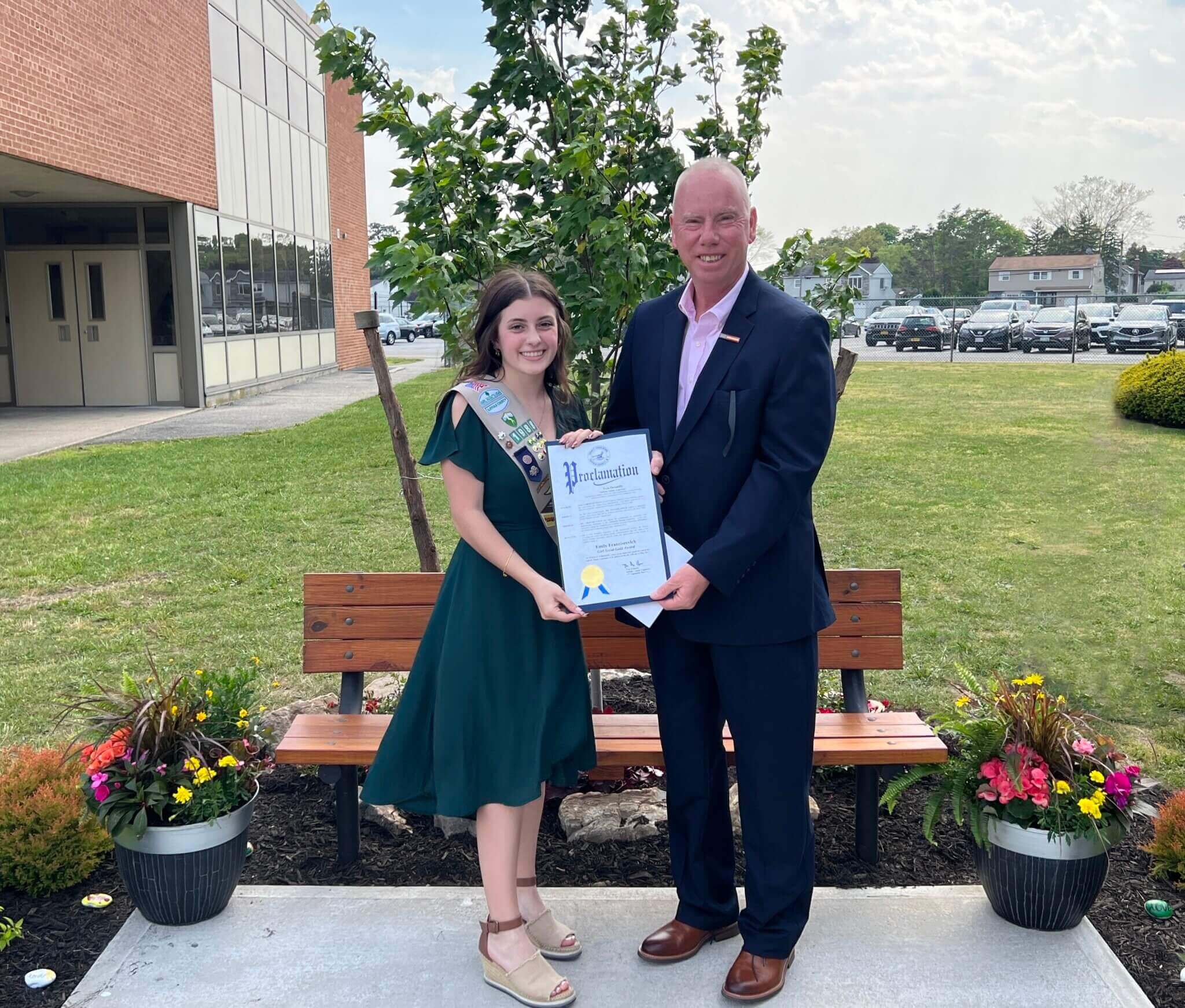 For her Girl Scout Gold award-winning project, a Deer Park High School student spearheaded the construction of a memorial bench and garden in honor of those with district ties who have died.