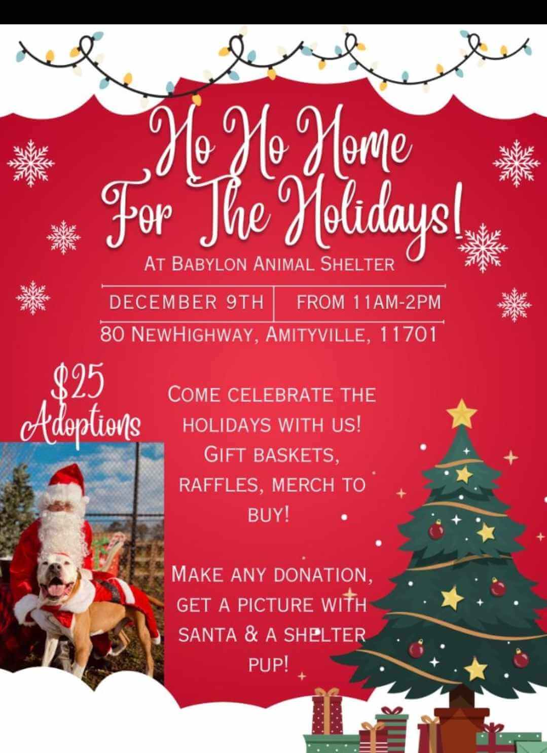Visit the Town of Babylon Animal Shelter, 80 New Highway, Amityville, on December 9, 2023, from 11-2pm for their Ho Ho Ho Home for the Holiday’s adoption event! Adoptions are reduced to only $25 which means it’s the most wonderful time of the year to bring home a new best friend! There will be gift baskets, raffles and merch to buy. Make a donation and receive a picture with Santa and a shelter pup!