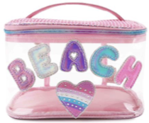 - Kids will love to be the talk of the boardwalk with the ‘Beach’ Clear Glazed Tote Bag. Decorated with bright, bubble-letter patches that sparkle and shine in the sun, this tote is the perfect place to stash your towels, sunnies and next great spring break beach read. Parents will love to keep seaside essentials secure in the ‘Beach’ Clear Glam Bag that is adorned with a pink straw top, glittery mermaid bubble-letter appliqués and a striped rhinestone heart patch to feel all the beachy love this spring break.