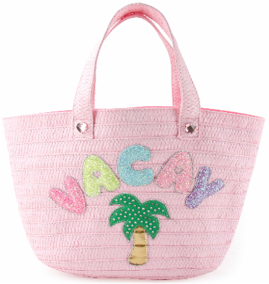 - Accessorize in style as you transport the family to a spring break paradise with the chic OMG ‘Vacay’ Pink Straw Tote Bag and ‘Vacay’ Slim Straw Wristlet. Kids will love that this handbag-inspired tote bag is made of soft pink straw for comfortable wear and it is embellished with playful details, including heart-shaped gem accents and a large rhinestone palm tree patch. Parents will love the matching wristlet since it keeps necessities nearby and does so in style with decorations in a tropical ombre print.